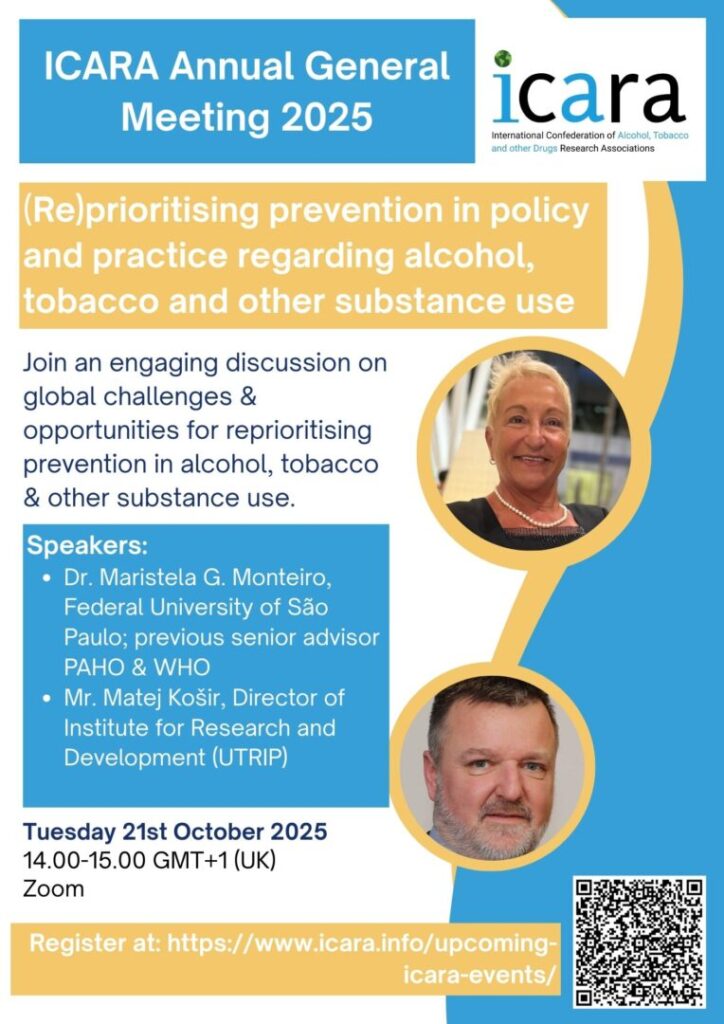 The International Confederation of Alcohol, Tobacco and Other Drugs Research Associations (ICARA) invites you to join our on Tuesday 21st October, 14.00-15.00 via Zoom.